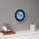 This is a very simple clean design for those that enjoy the uncluttered look. Features cornflower blue and black circles within each other, with the blue circle on the inside, and an outer rim. The clock has white numerals.