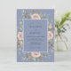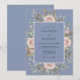 This design features a serene periwinkle blue backdrop adorned with painterly blush pink roses and delicate buds. Whimsical eucalyptus leaves and golden-tan foliage provide a lush, organic feel to the overall aesthetic. The watercolor textures create a romantic and timeless atmosphere perfect for a spring or summer event.