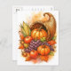 Celebrate the spirit of abundance with this elegant Thanksgiving postcard featuring a watercolor-style cornucopia filled with pumpkins, apples, corn, grapes, and fall leaves.
