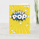 Fun little popped popcorn, hand drawn, illustrations on a shades of yellow, ray burst background, with Super Pop in a playful font on a colourful, bright, comic book pop art bursting splash and little stars in yellow. On the inside a blank canvas to make it your own special design with a bright yellow background with popcorn on the back.