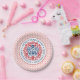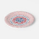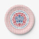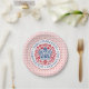 Red paper plates showing the official Coronation Emblem of King Charles III 2023