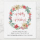 Corporate Christmas wine label for your company's holiday events or for gifts to your customers featuring a watercolor wreath of a red and white poinsettia floral blooms and eucalyptus and seasonal greenery. "Happy Holidays" is written in a contemporary red script and you can personalise a happy new year or other greeting and your business' name underneath in simple modern typography.