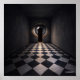 A long checkered corridor ends in a door that is also a wide-open eye.