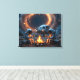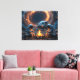 Two miniature astronauts sit around a small campfire on a desolate, rocky planet, roasting marshmallows. A massive black hole looms in the background.