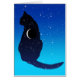 Note card in a silhouette of an elegant sitting cat patterned with a starry sky and crescent moon on an evening blue, starry background