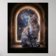 A graceful cosmic cat sits quietly by a glowing window into the universe, its sleek body formed from soft nebula textures and shimmering starlight. Its luminous eyes gaze outward, creating a sense of curiosity and calm. The cosy interior blends seamlessly with the infinite cosmos beyond, resulting in a warm yet mysterious atmosphere. This artwork is perfect for cat lovers, modern interiors, and decorative spaces that embrace both comfort and celestial beauty.