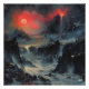 Illustration that mixes impressionism and surrealism, showing a cosmic landscape with a planet engulfed in flames, turbulent seas and rock formations emerging from the ocean in a chaos of fire and stone. Perfect for lovers of fantastic art and cosmos.