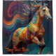 The artwork showcases a surreal, cosmic horse in a vivid, psychedelic dreamscape. The horse, primarily white with a flowing, ethereal mane, is set against a backdrop of colorful swirling galaxies and star-filled space. Its expressive blue eye draws attention, featuring intricate, colorful markings around it that blend into the cosmic patterns of the background. The horse's body is adorned with mesmerizing swirling shapes and patterns in vibrant hues of oranges, purples, blues, and yellows, giving it a magical, almost otherworldly presence.