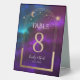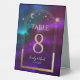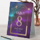 Cosmic Purple Teal Gold Sun Moon Astronomy Wedding Table Numbers Table Tent Sign features gold sun, moon and stars with a golden frame on colourful mystical purple, teal and blue cosmic background. Inside is your custom table number information. Designed for you by Evco Studio www.zazzle.com/store/evcostudio