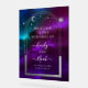 Cosmic Purple Teal Sun Moon Stars Welcome Sign Acrylic Welcome Sign features silver sun, moon and stars with a silver frame on colourful mystical purple, teal and blue cosmic background. Inside the frame is your custom text in elegant white calligraphy script. Designed for you by ©2024 Evco Studio www.zazzle.com/store/evcostudio