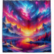 Immerse yourself in a stunning cosmic landscape with this vibrant design featuring a sky filled with swirling nebulous clouds in breathtaking rich shades of red, purple, pink, blue, orange, and yellow, and twinkling stars dotted throughout like sparkling diamonds. The scene transitions into a gorgeous fiery sunset, casting warm hues across the horizon. Snow-capped mountains stand majestically in the background, while beautiful trees frame the foreground. The calm water below reflects the vivid colours of the sky, creating a mesmerising and harmonious scene. This artwork perfectly blends the beauty of the cosmos with the tranquillity of nature, making it an ideal addition to any space.