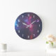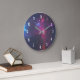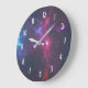 A clock with a blue, pink and black fantasy image of cosmic space with stars and wispy Nebula.