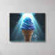 An astronaut floats towards a giant ice cream cone illuminated by a hovering UFO. The ice cream is a swirl of purple and blue with gold sprinkles.