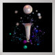 A central trumpet-like object surrounded by colourful spheres and starbursts is set against a black background. The arrangement gives a sense of floating or cosmic dispersal.