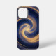An abstract, dark celestial image featuring a brilliant, swirling vortex of golden and amber light against a deep blue, star-speckled background. The energy spirals inward, suggesting a dynamic cosmic event, a galaxy, or a portal.