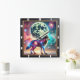 A vibrant depiction of a wolf surrounded by cosmic elements, colourful nebulae, and a full moon, integrated into an artistic clock design, symbolising harmony between nature and the universe.