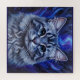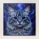 This puzzle features a vibrant, colourful painting of a cat's face. The cat is a grey tabby with striking blue eyes. Its fur is detailed with various shades of grey and white, creating a textured appearance. The cat has long whiskers extending outwards from its nose. The background is a swirling, abstract depiction of a night sky or cosmic scene, dominated by shades of blue and purple. There are flame-like shapes and small white dots resembling stars scattered throughout the background. Above the cat's head, a bright, curved blue light emanates upwards, adding to the fantastical and ethereal quality of the artwork. The painting style appears to be somewhat impressionistic, with visible brushstrokes and a focus on capturing light and colour. The overall impression is one of magic and wonder, with the cat appearing as a celestial or mystical being. Finished as an oil paint art print.