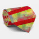 This necktie features a crimson backdrop with black dry brushing and strips of washi featuring an abstract in shades of orange, red, grey, yellow, red, green, and chartreuse.