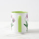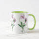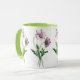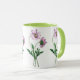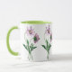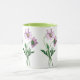 Purple Cosmos antique watercolor on a classic ceramic mug with gren rim and green handle.