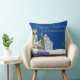 This custom throw pillow features a cosy winter night theme on a dark blue background. An image of a little car is pictured driving past houses in a little village or town on Christmas eve, with a tree on it's roof.