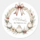 A soft, hand-painted Christmas wreath adorned with beige ornaments, pine sprigs, and a muted red bow, creating a serene, rustic holiday vibe. Perfect for sealing holiday cards, packaging festive gifts, or adding a charming accent to your winter celebrations. This design blends Nordic calm with nostalgic detail for a timeless seasonal touch.