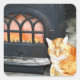 This sticker features an orange tabby cat warming himself by the fire of a woodstove on a cold winter night in New England.