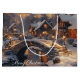 A Christmas holiday gift bag featuring a watercolor illustration of a moonlit village on a snowy night with a flowing river meandering through brightly lit stone cottages and charming stone walking bridges adorned soft glowing lanterns. Merry Christmas greeting displayed on front and back of bag.