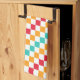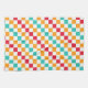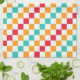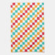 Alternating red, orange, teal, and white squares create a colourful, vibrant chequerboard pattern, conveying an energetic and playful tone.