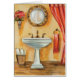 © Silvia Vassileva / Wild Apple. This contemporary bathroom features a round mirror, a white sink, curtains, and other decorations. This bathroom comes in warm, cosy colours.