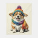 A soft, cosy blanket featuring an adorable corgi puppy with a happy expression, wearing a