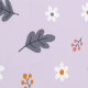 This delicate floral pattern features simple, hand-drawn elements of white daisies, soft leaves, and vibrant berries. Set against a light lavender background, the mix of muted greys and pops of orange, purple, and pink create a charming, minimalist aesthetic. The design is lighthearted and playful, evoking a sense of calm and cosiness with its soft hues and whimsical arrangement.