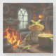 This stone coaster features a frog having coffee by the fire.