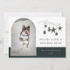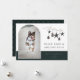 Trendy rustic Scandinavian style holiday photo card. Single photo with arch frame shape. Watercolor branch adorned with pinecones and decorative star ornaments, chic typography design with trendy plaid pattern backing.