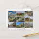 Postcard with a collage of the honey-coloured limestone architecture of the Cotswolds cottages in the small villages like Tetbury, Castle Combe, Painswick, Broadway and Bibury in England, UK with a white border and the text: 'Cotswolds'.