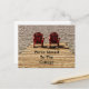 Adirondack beach chairs moving postcards. Rustic country brown burgundy, red, modern, chic, trendy, unique. Personalised retirement style design. Phrase 'We've Moved To The Cottage'. Customise your typography by font size, style, colour or remove if desired. Image copyright Marg Seregelyi Photography.