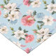 This table runner features a beautiful cottage garden floral pattern in soft shades of pink, blue and cream on light blue.