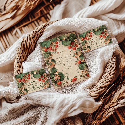 A romantic cottagecore bridal shower design inspired by vintage botanical illustrations. Lush strawberries, soft white blossoms, and winding greenery frame a warm parchment centre, creating a charming, garden-party feel. Perfect for spring and summer celebrations with a timeless, romantic aesthetic.