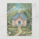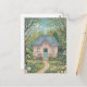 This whimsical artwork portrays a charming pink cottage nestled in the heart of a lush, enchanting forest. The cottage, with its slate-blue roof and inviting teal door, is surrounded by a profusion of colorful wildflowers in a soft, spring-like palette. A winding stone path leads the viewer to the front door, while the scene is framed by the embracing branches of two large, stylized trees. The sky is a serene teal with a gentle full moon and light clouds, adding to the magical, storybook atmosphere. This piece evokes a feeling of peace, nostalgia, and rustic charm.