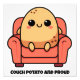 Cute print kawaii happy potato chilling on his red armchair with big round eyes and a sweet smile. Below the potato are the words "couch potato and proud". Ideal gifts for potato lovers, and those who like food, puns and chilling.