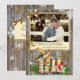 Rustic weathered wood background with white, blue and gold snowflakes, his and hers cowboy boy boots with poinsettias and pine berries photo Christmas card.