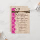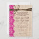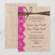 This rustic wedding invitation is perfect for any country western wedding. It features a rustic country printed burlap background on both sides of the invitation. The invitation has a printed hot pink lace embellishment on the side. The top has a printed twine embellishment. The burlap, lace, and twine are just printed designs. It is not actual burlap fabric or actual lace or twine.