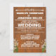 Textured Brown Wood Background with Bold White Lettering and white flowers. Add your wedding details for a one of a kind wedding invitation.