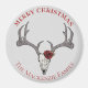 This country Xmas "Merry Christmas" magnet features a hand-drawn illustration of a deer head skull and antlers adorned with red roses against an elegant pearl grey background. Personalise with a holiday greeting and your family name. Printed on both sides.