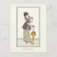 A postcard with the French fashion vintage illustration from 1912, Robe de Campagne (Country Dress). A woman leaning on a parasol dressed in a purple pleated jacket and flowered skirt. A digitally altered and enhanced image from the Journal des Dames.