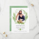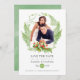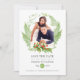 Green and white wedding save the date photo cards featuring ferns, wildflowers and strawberries and a sage green watercolor wash background.