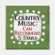 A funny typographic design that says "Country Music: Can Recommend, 5 Stars". It's black and red text on a white rectangle with funky, playful white dots surrounding it, all on a green background.