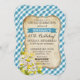 Country picnic blue gingham check with daisies birthday party invitation card design.