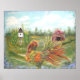 Original painting in acrylic on canvas shows biightly coloured rooster in the foreground with a barn, birdhouse, corn, meadow and trees in the background against a blue sky dotted with white clouds