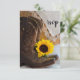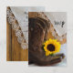 Customise the charming Country Sunflower and Lace Western Wedding RSVP Response Card with your marriage reply date and pair with the matching invitations to create a coordinated stationery set. These casual yet classy custom rustic chic wedding r.s.v.p. cards feature a quaint floral photograph of brown leather western cowboy boots, yellow sunflower blossom, vintage lace trimmed white linen handkerchief and white bridal veil with a brown barn wood background.