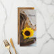 Customise the charming Country Sunflower and Lace Western Quinceañera Party Menu with the details of the meal that you will serve at your rural farm or ranch style barn party sweet fifteen celebration event by adding the salad or first course, entree or second course and dessert or third course. This charming custom rustic sweet 15 menu features a quaint floral photograph of a yellow sunflower blossom, brown leather cowboy boots a vintage white lace trimmed hankie and brown barn wood background. Perfect inspo for your cowgirl or vaquera.